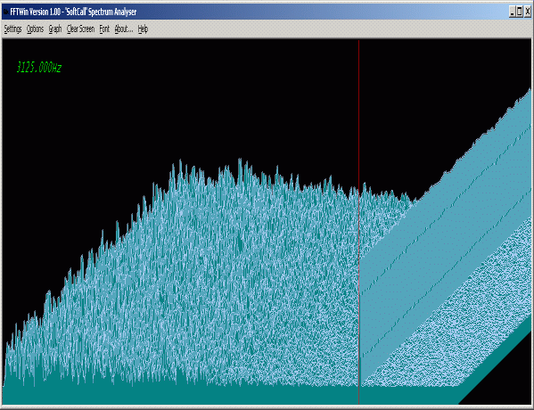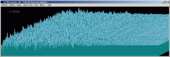 Click on the image for a larger version. In this image, front-to-back represents a section of the image at right angle across the trail, 200 pixels wide, while left to right represents increasing frequency (from DC to about 11.5KHz). The obvious spike is an injected test signal used to verify operation of the signal processing chain (equivalent to a superimposed grid of vertical bars spaced about 2.5 pixels apart), and as is apparent there's no visible correlation between the peaks in the FFT outputs (which is what you'd expect to see if a periodic signal was present from the wings - two 'humps' should appear either side of the centre line, probably close to the left edge as this represents lower frequencies). In other words, if there's a periodicity in the pixels adjacent to the trail caused by the insect's wings, it's buried too deep in the noise to be easily detectable. FFT analysis (additional)On the discussion forum, victorengel suggested subtracting the FFT for a strip outside (but near to) the wing shadow area from the FFT(s) of strips inside. The pseudo-3D image shown below was created this way. Front-to-back is a 200-pixel line perpendicular to the trail, while left-to-right represents increasing frequency.